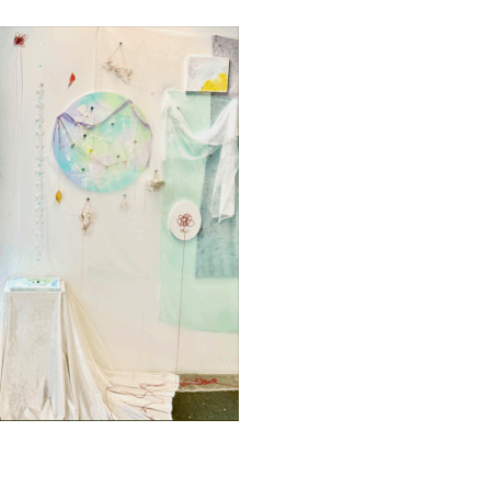 Feathers, yarn, plastic spheres, acrylic, lighting installation, ribbons, wooden swing, mirrored stainless steel